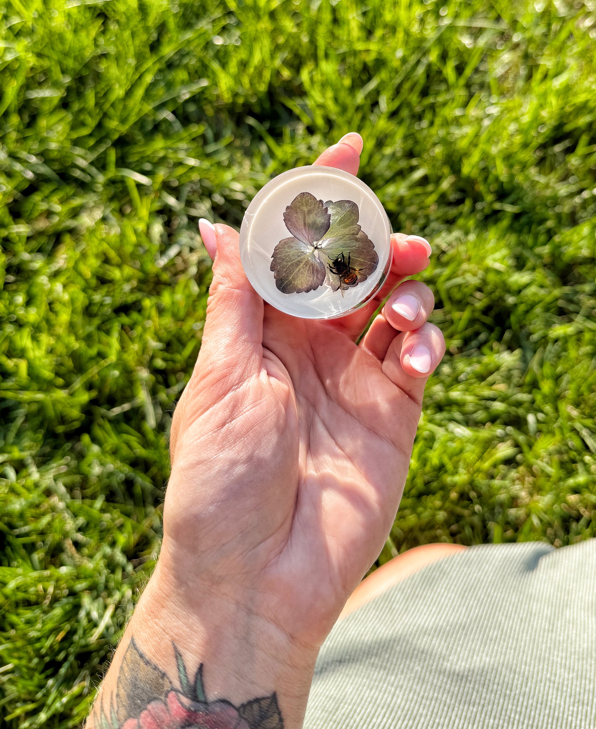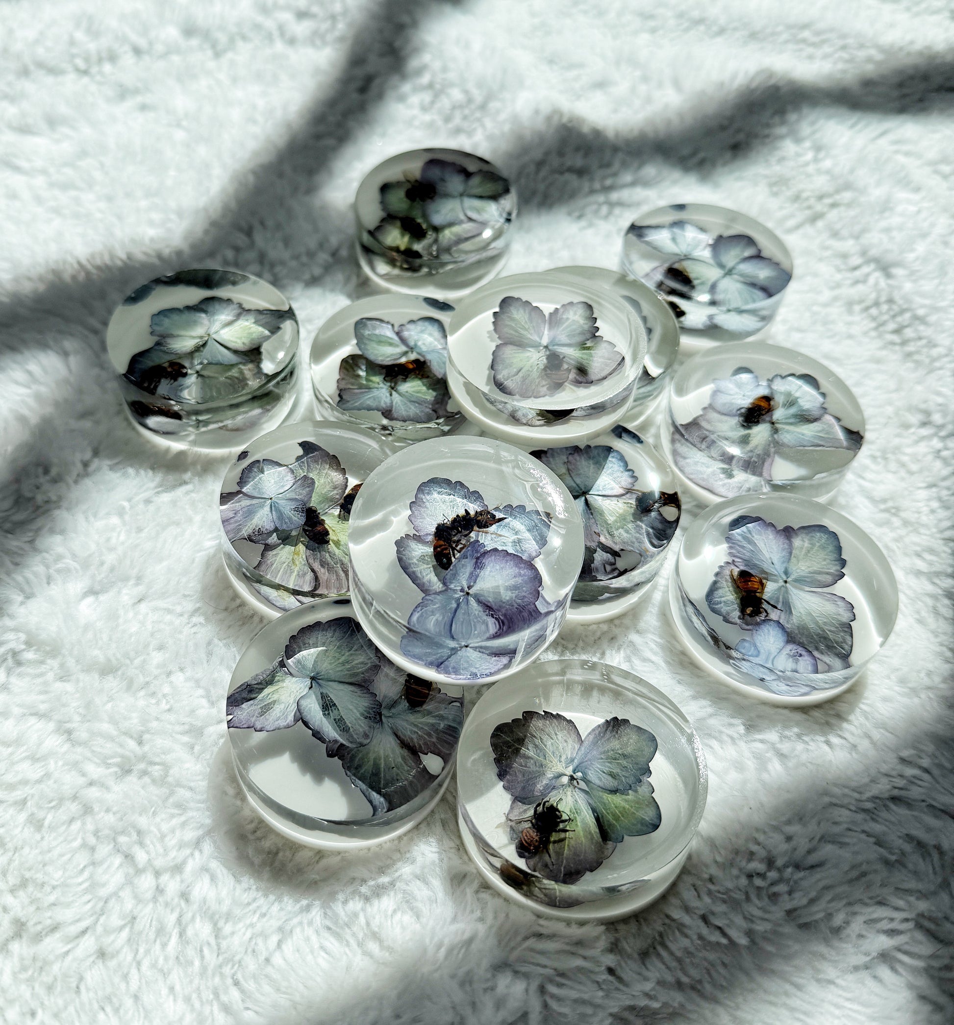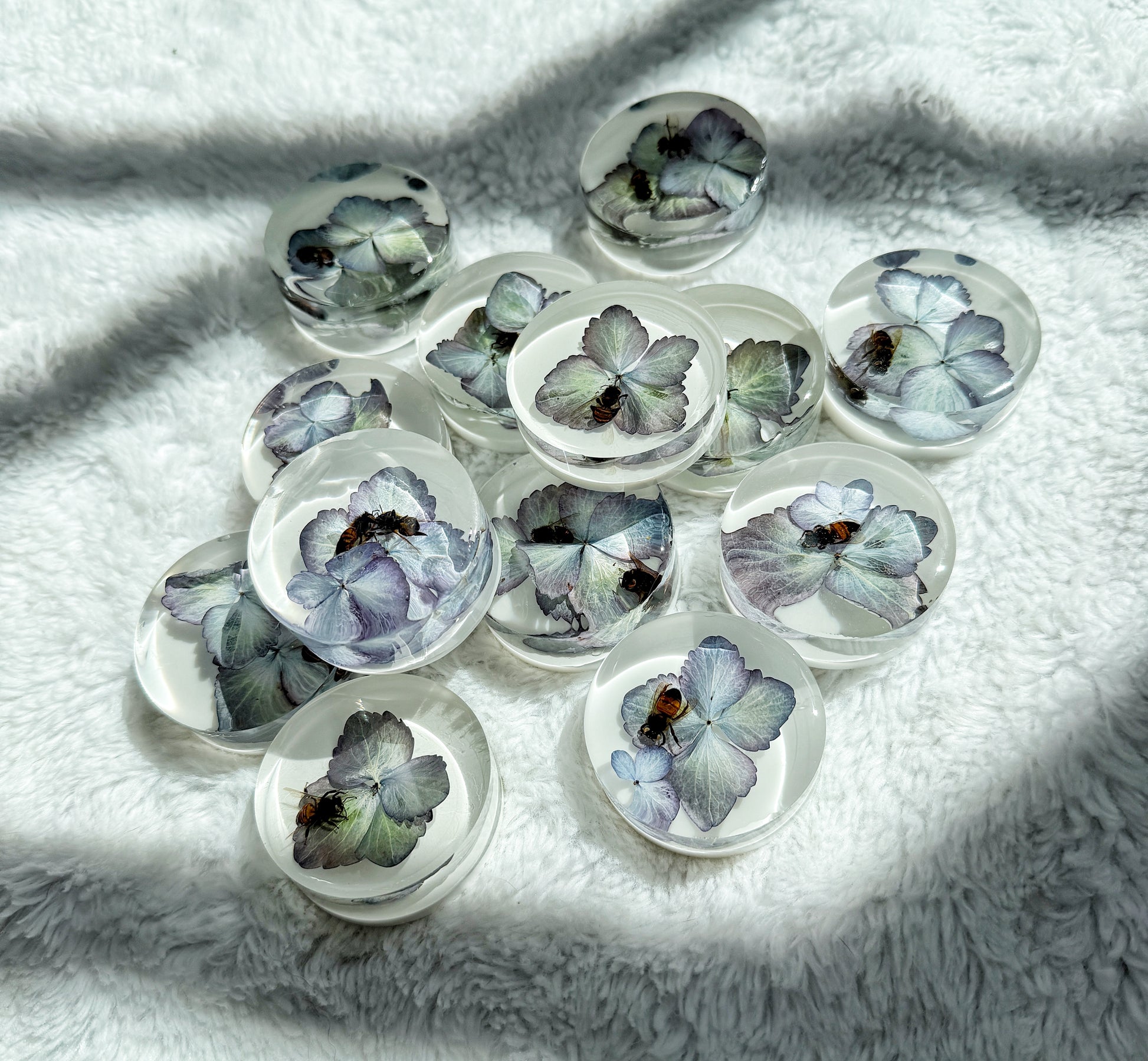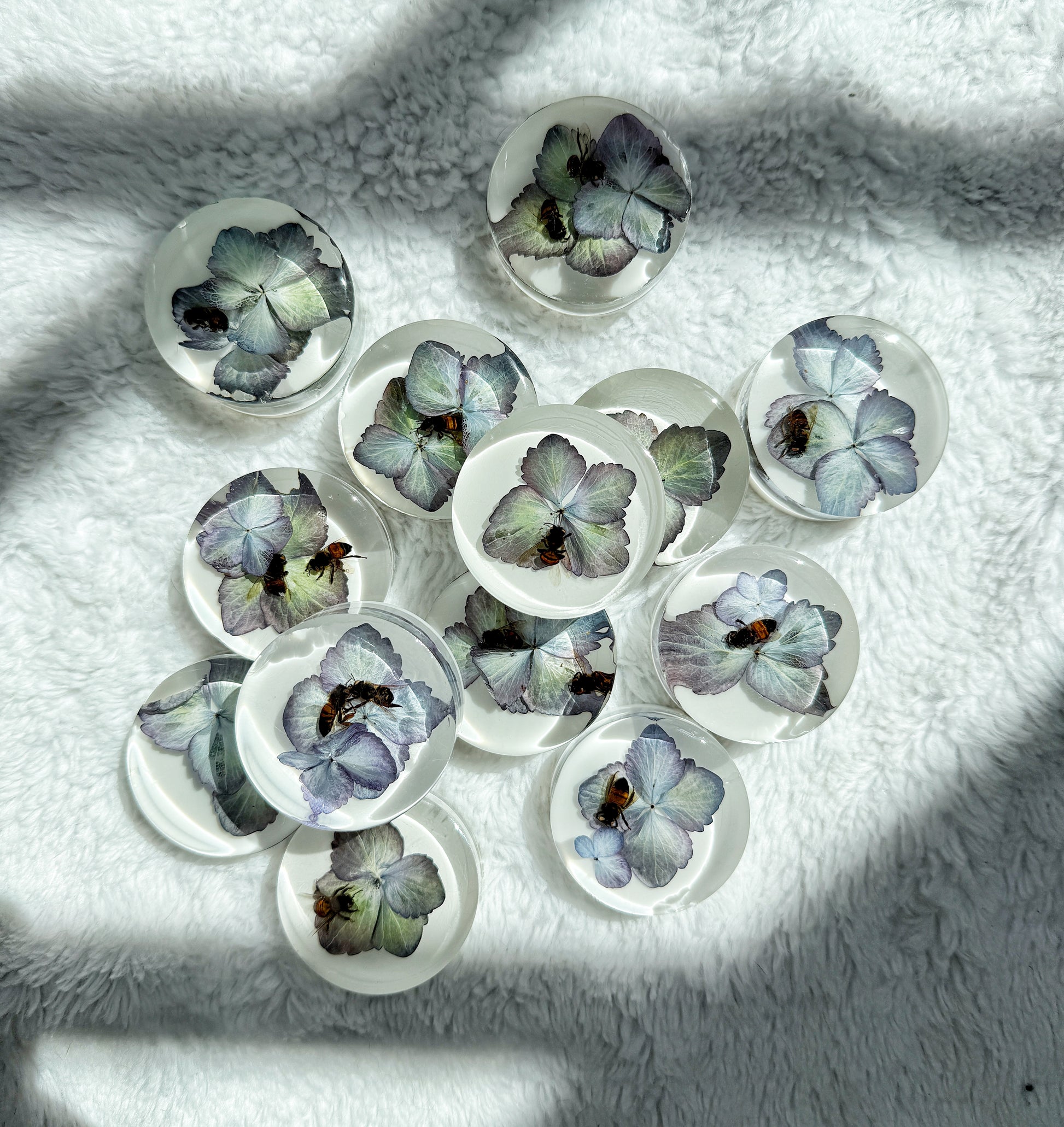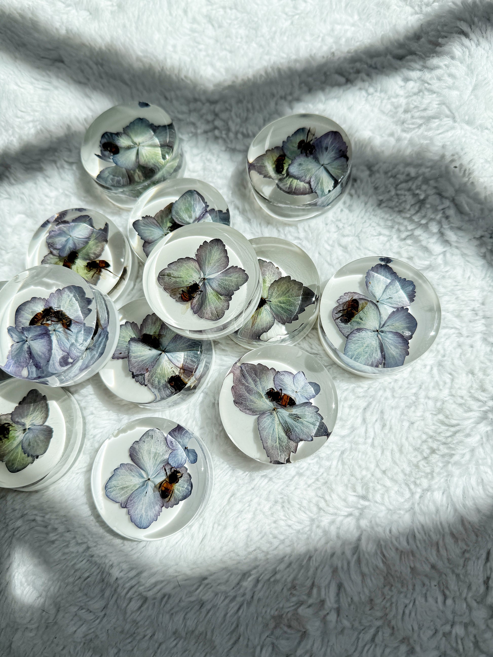 Each piece contains 1–2 bees and 1–2 hydrangea blooms — all thoughtfully composed and preserved by hand.