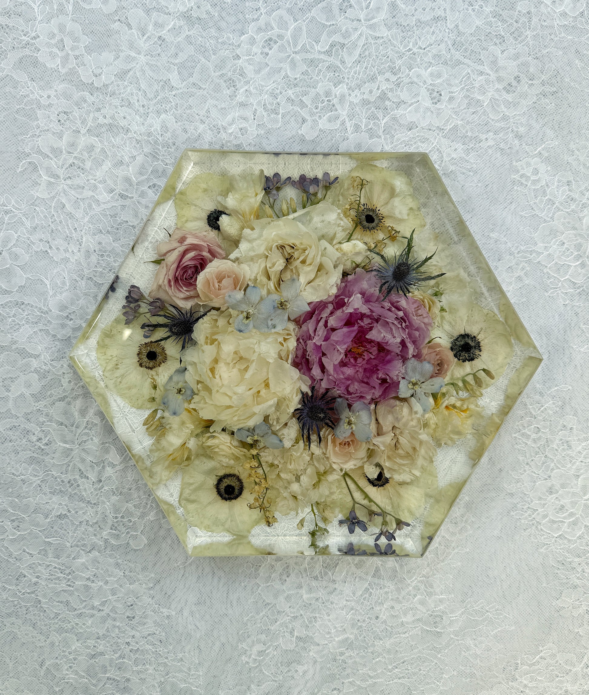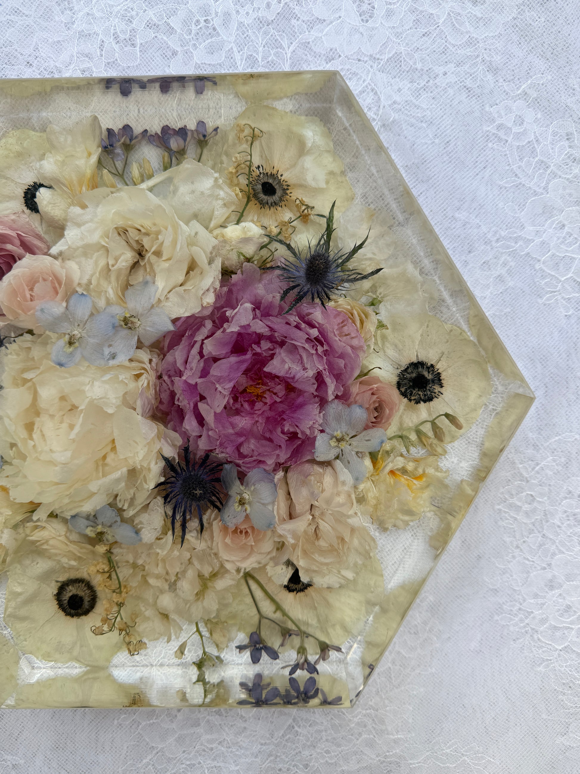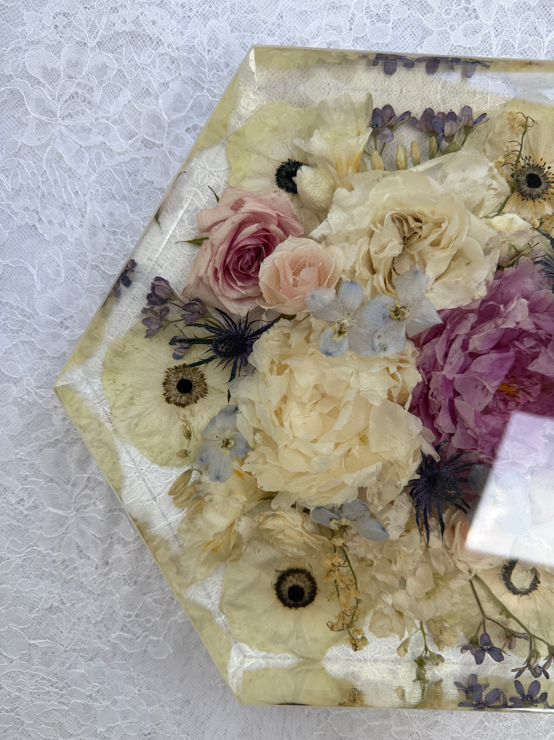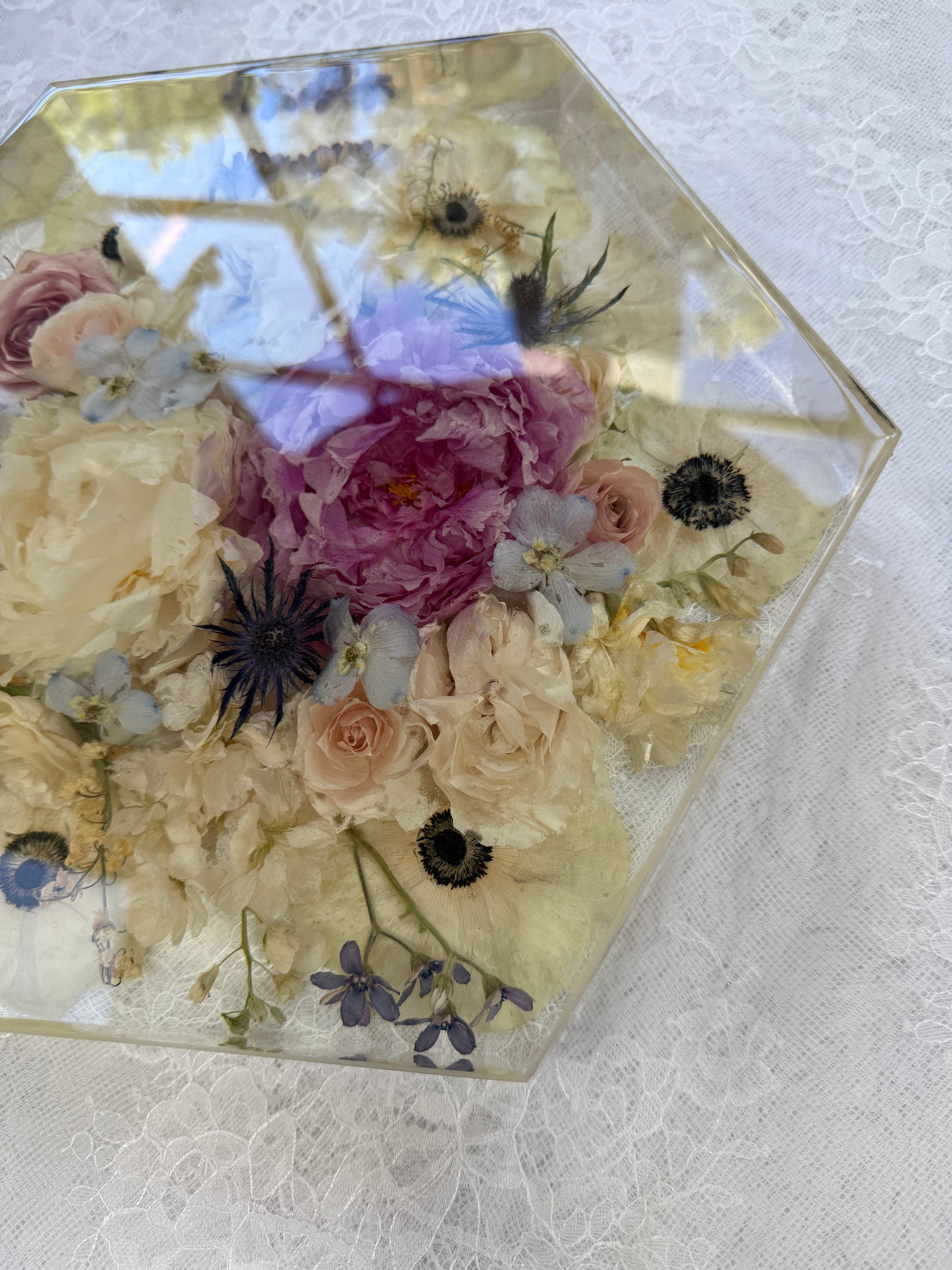 This hexagon display piece is a modern and elegant way to preserve your cherished flowers, showcasing them in a timeless geometric design.