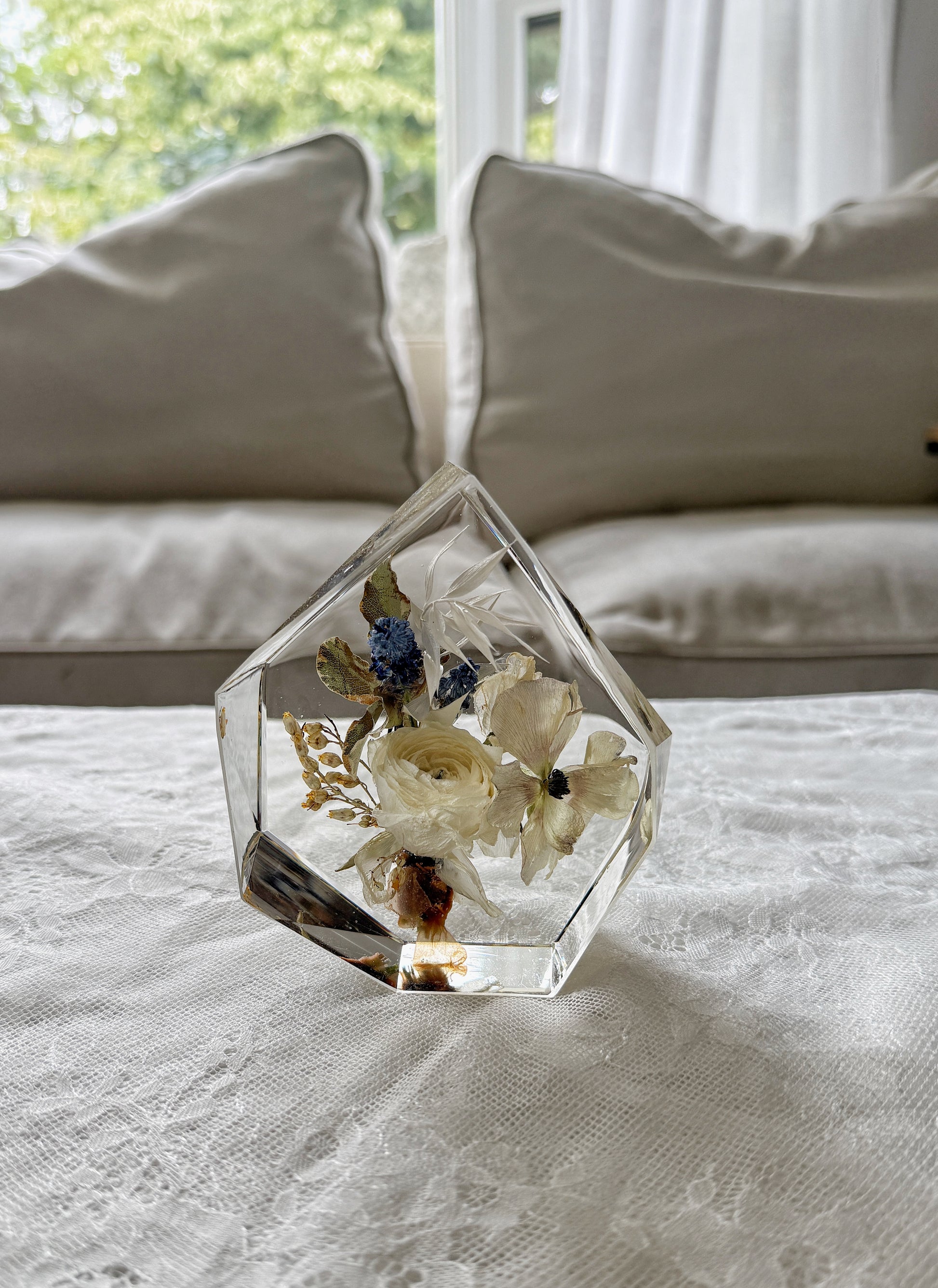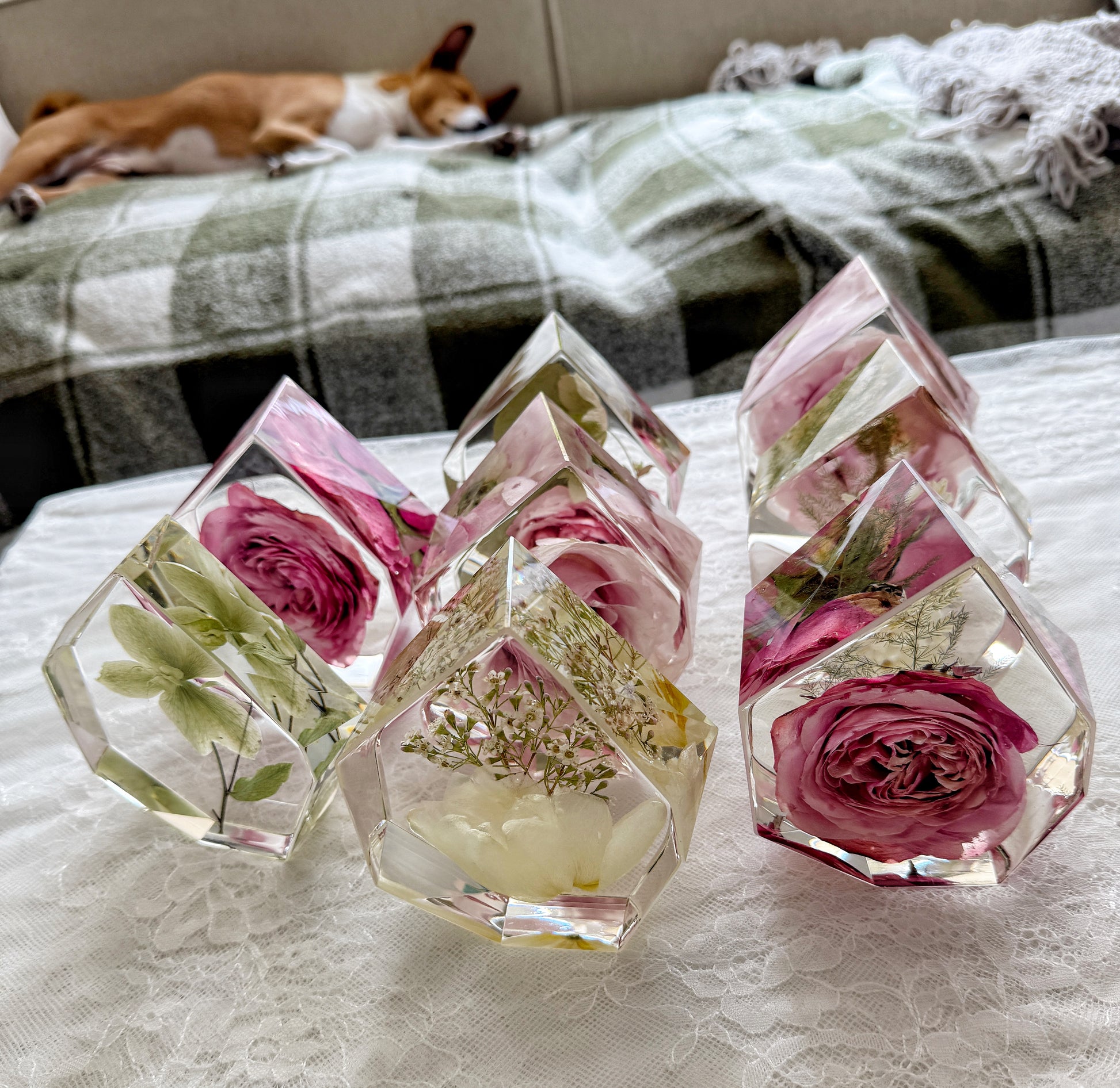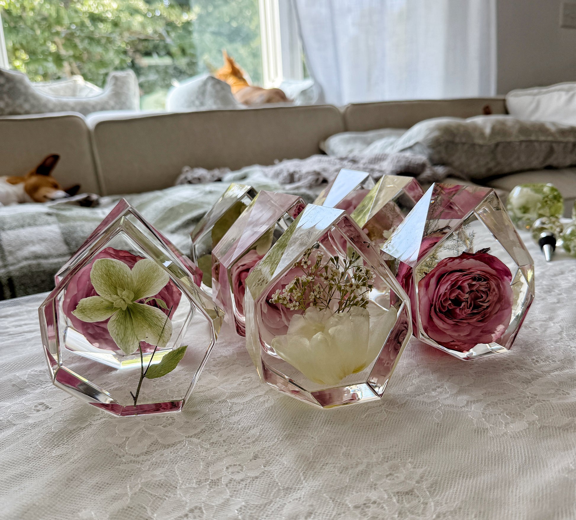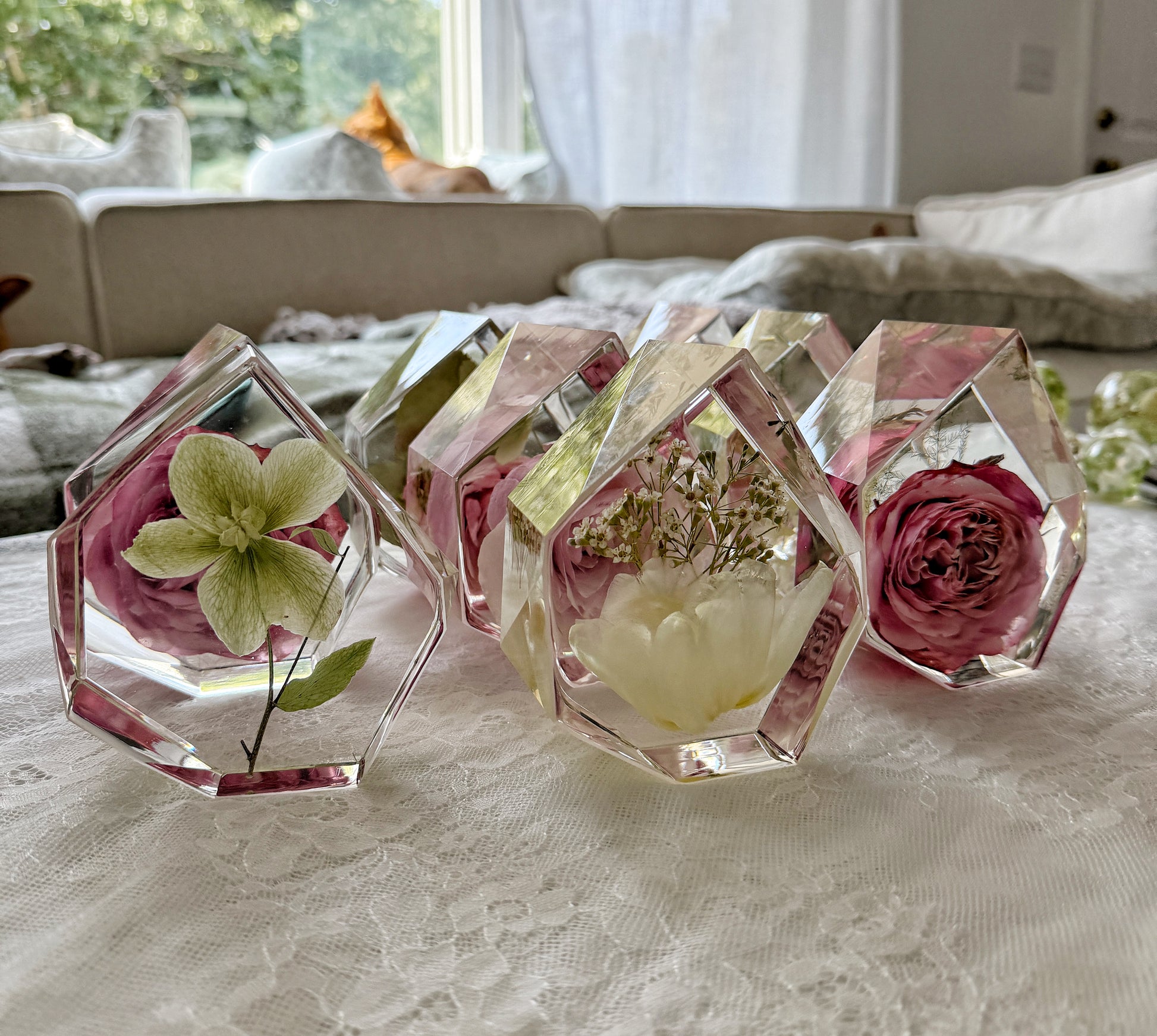 This small gem mold is a beautiful and compact way to preserve flowers, making it a perfect option for boutonniere or single blooms. Its faceted design enhances the natural beauty of the preserved florals, creating a timeless keepsake.