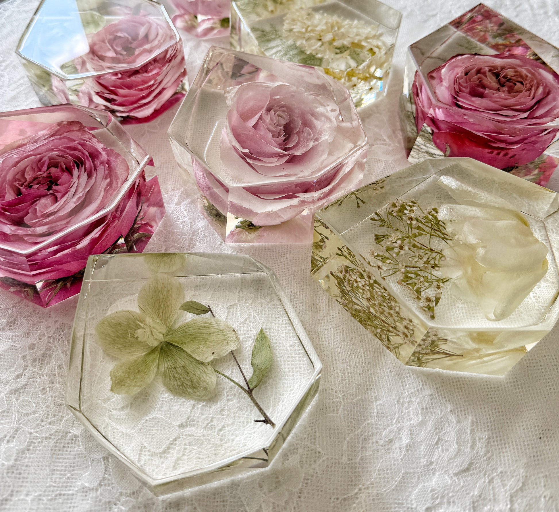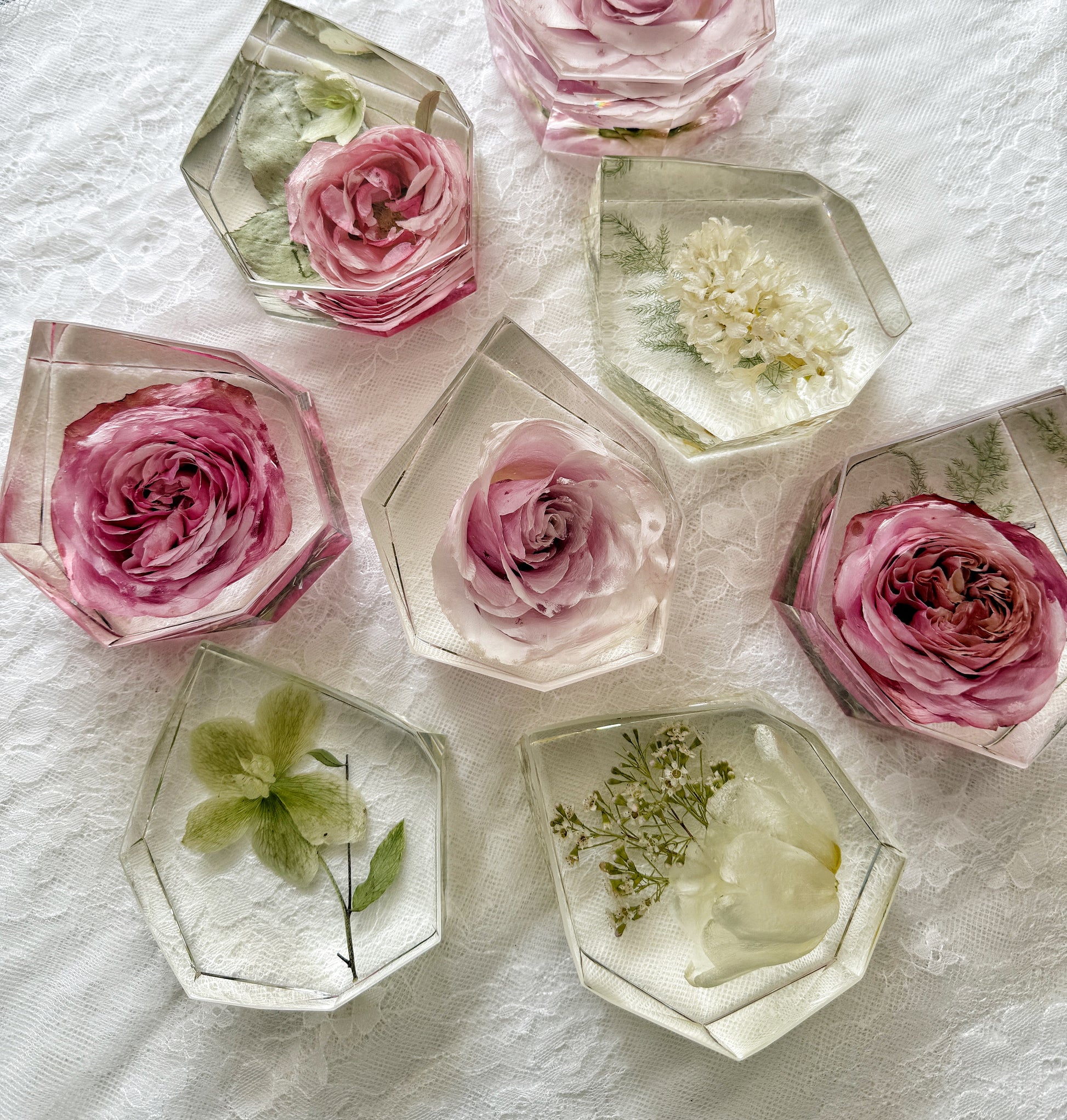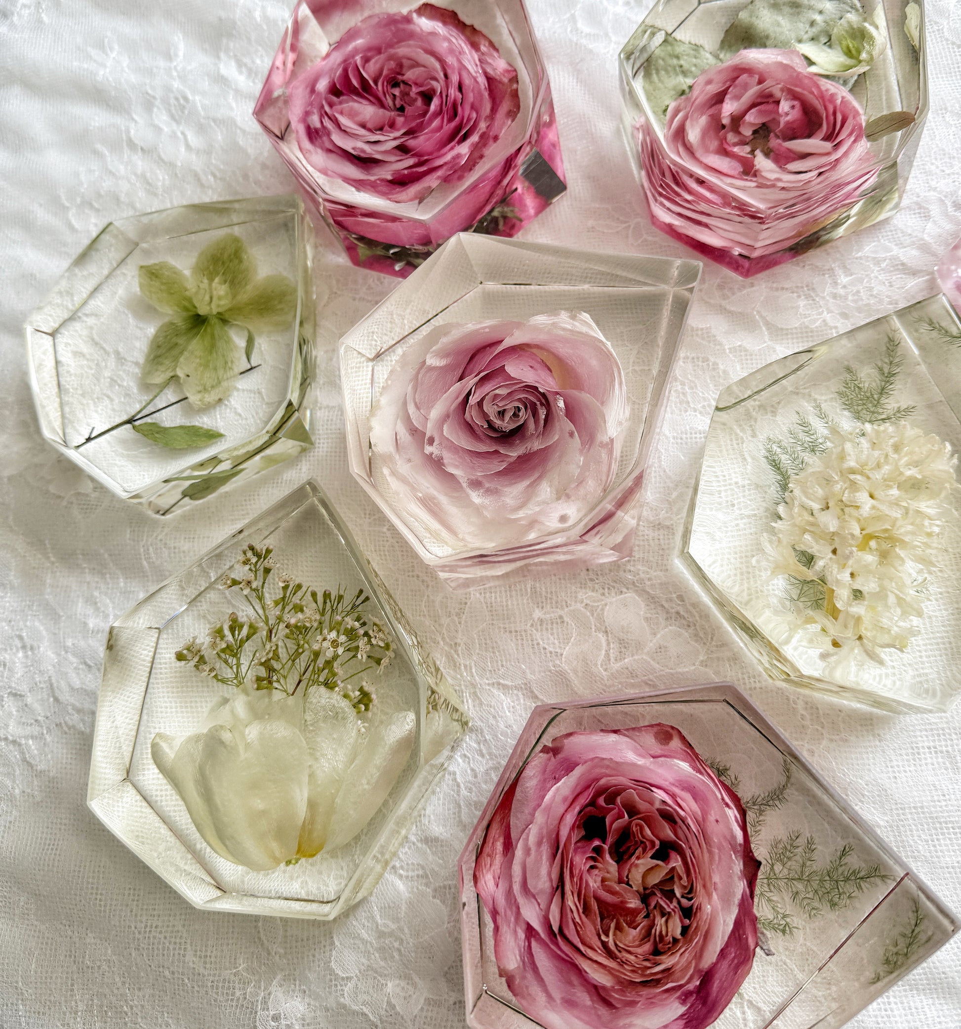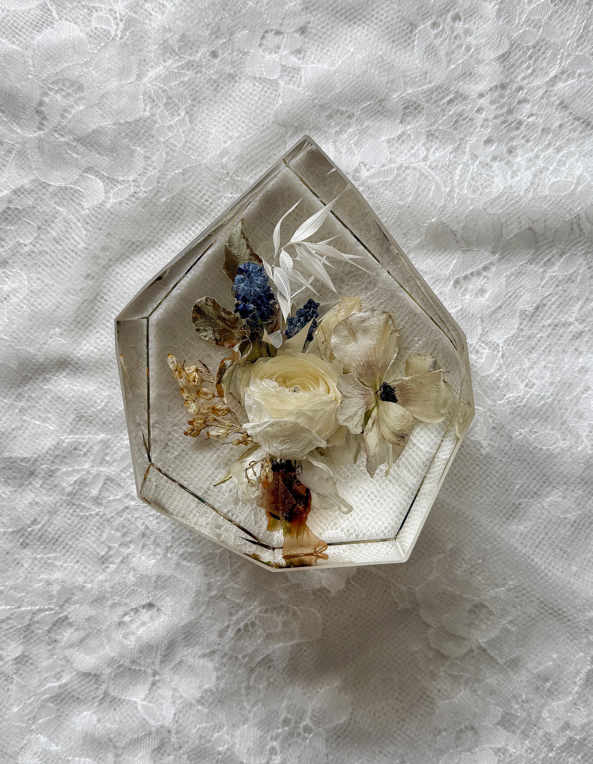 This small gem mold is a beautiful and compact way to preserve flowers, making it a perfect option for boutonniere or single blooms. Its faceted design enhances the natural beauty of the preserved florals, creating a timeless keepsake.