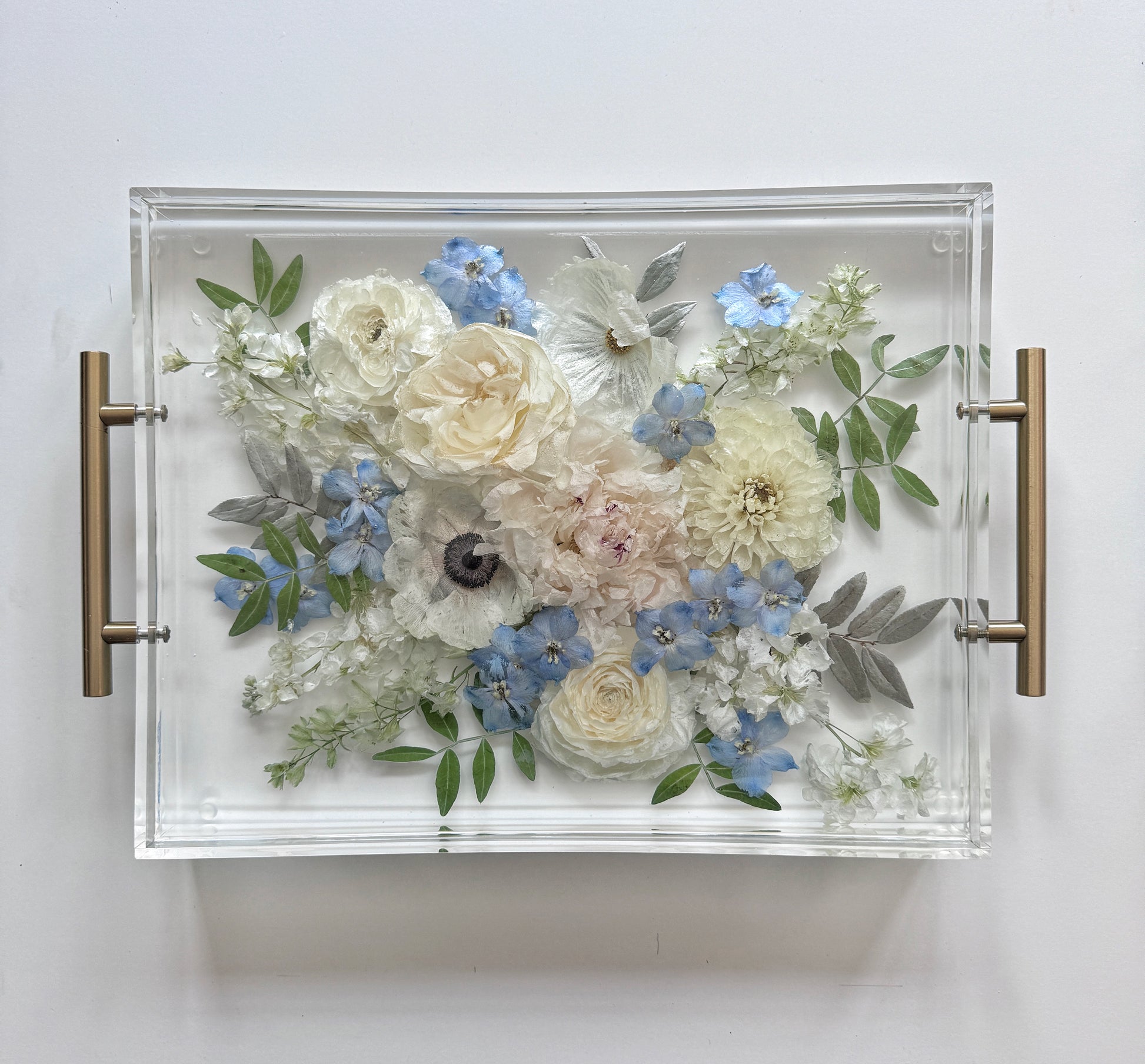 This tray stands 2" high, making it ideal for preserved flowers that are either pressed flat or shorter blooms. Taller flowers, like a full rose (around 3" - 4"), require larger pieces like tables or display blocks to maintain their 3D form.
