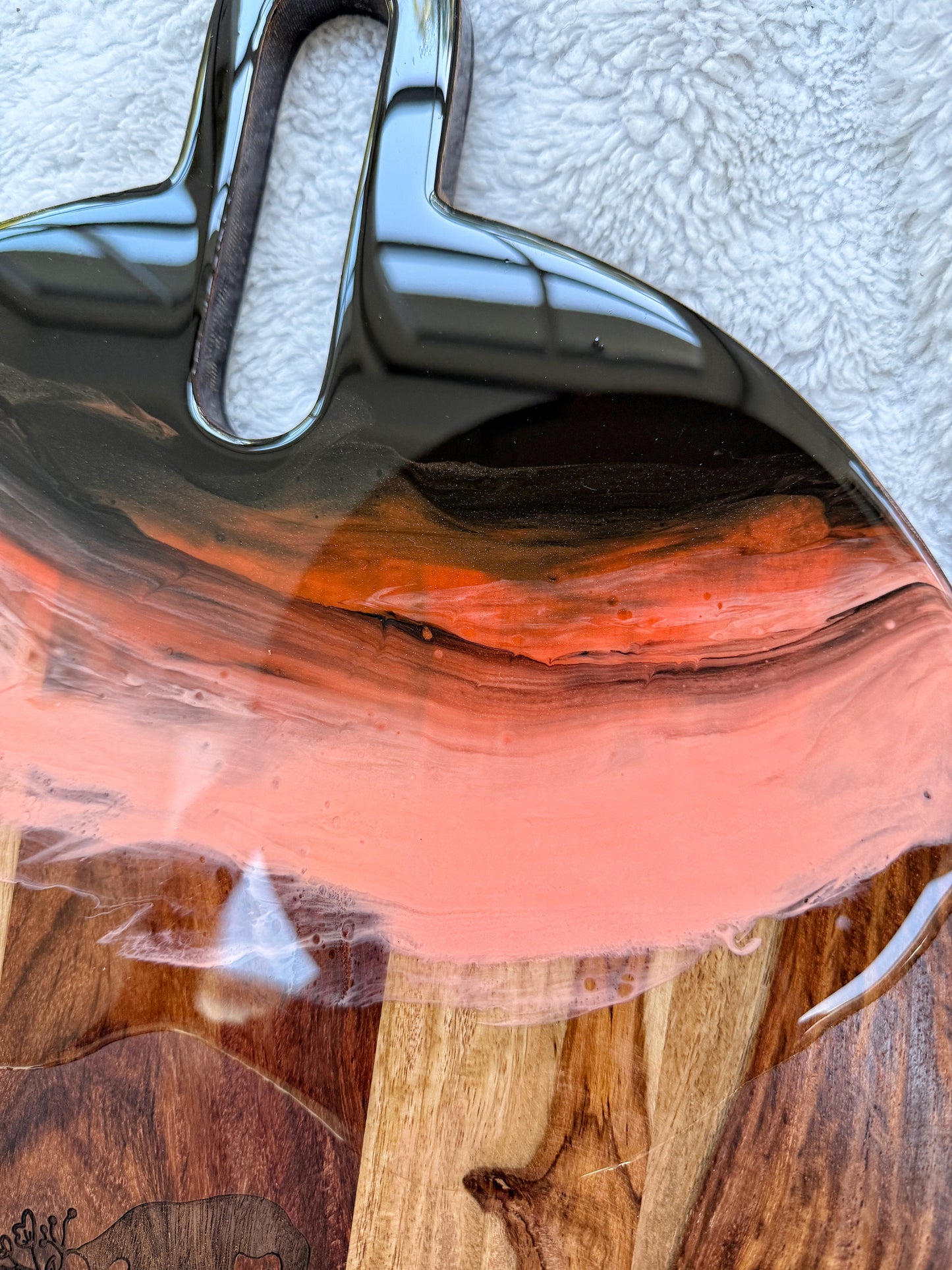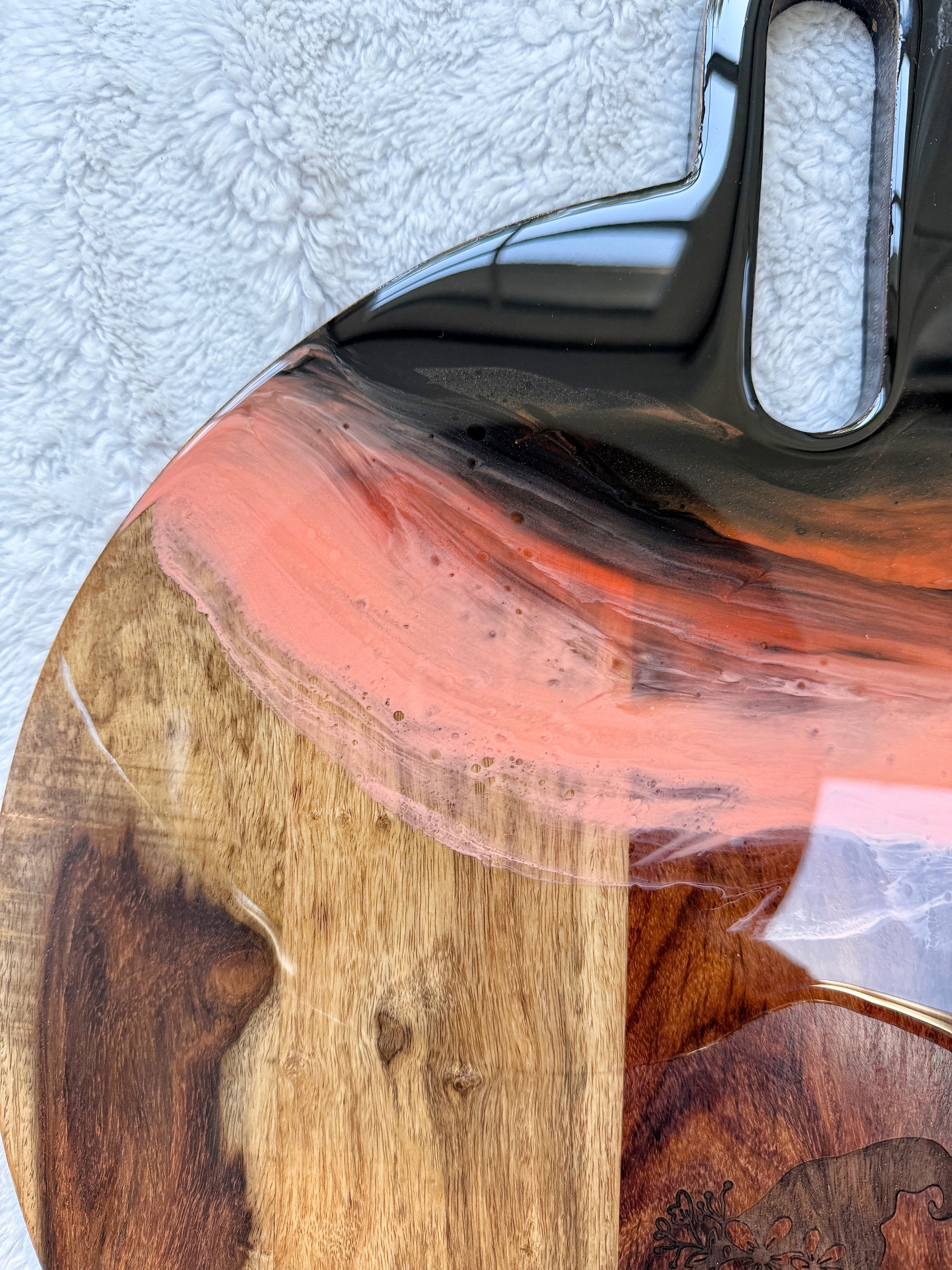 Each board features an intricate Halloween-themed laser engraving, hand-poured resin work (some with a wave, some without), and a rich, moody palette perfect for seasonal displays, charcuterie spreads, or as a one-of-a-kind decor piece.