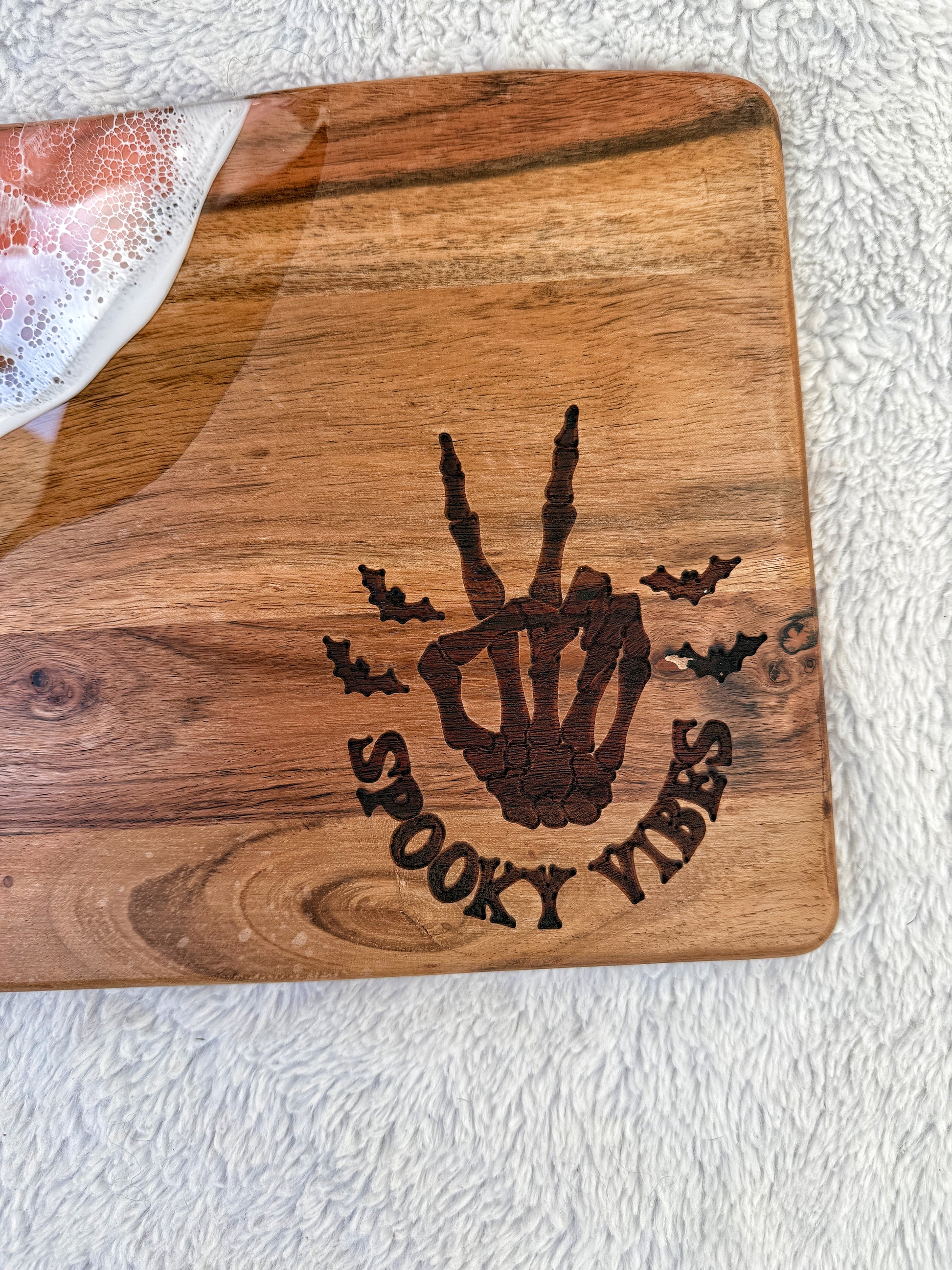 Each board features an intricate Halloween-themed laser engraving, hand-poured resin work (some with a wave, some without), and a rich, moody palette perfect for seasonal displays, charcuterie spreads, or as a one-of-a-kind decor piece.