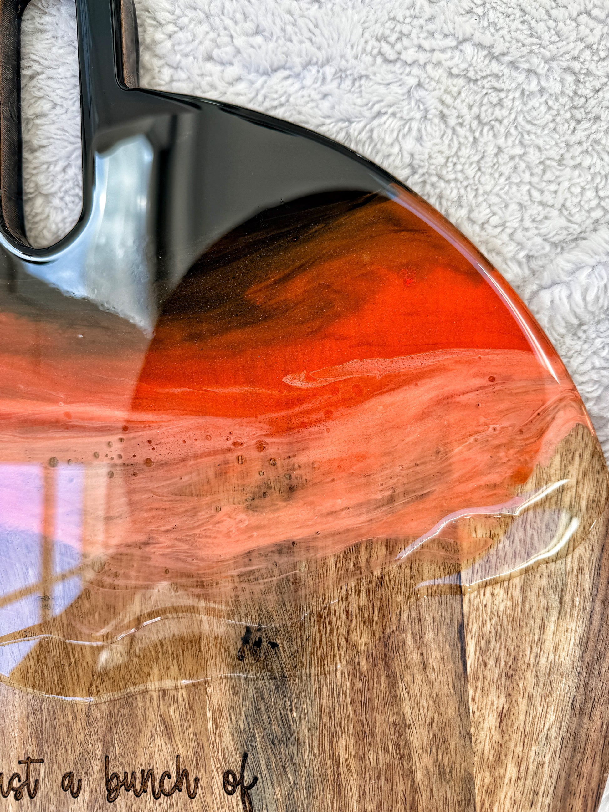 Each board features an intricate Halloween-themed laser engraving, hand-poured resin work (some with a wave, some without), and a rich, moody palette perfect for seasonal displays, charcuterie spreads, or as a one-of-a-kind decor piece.