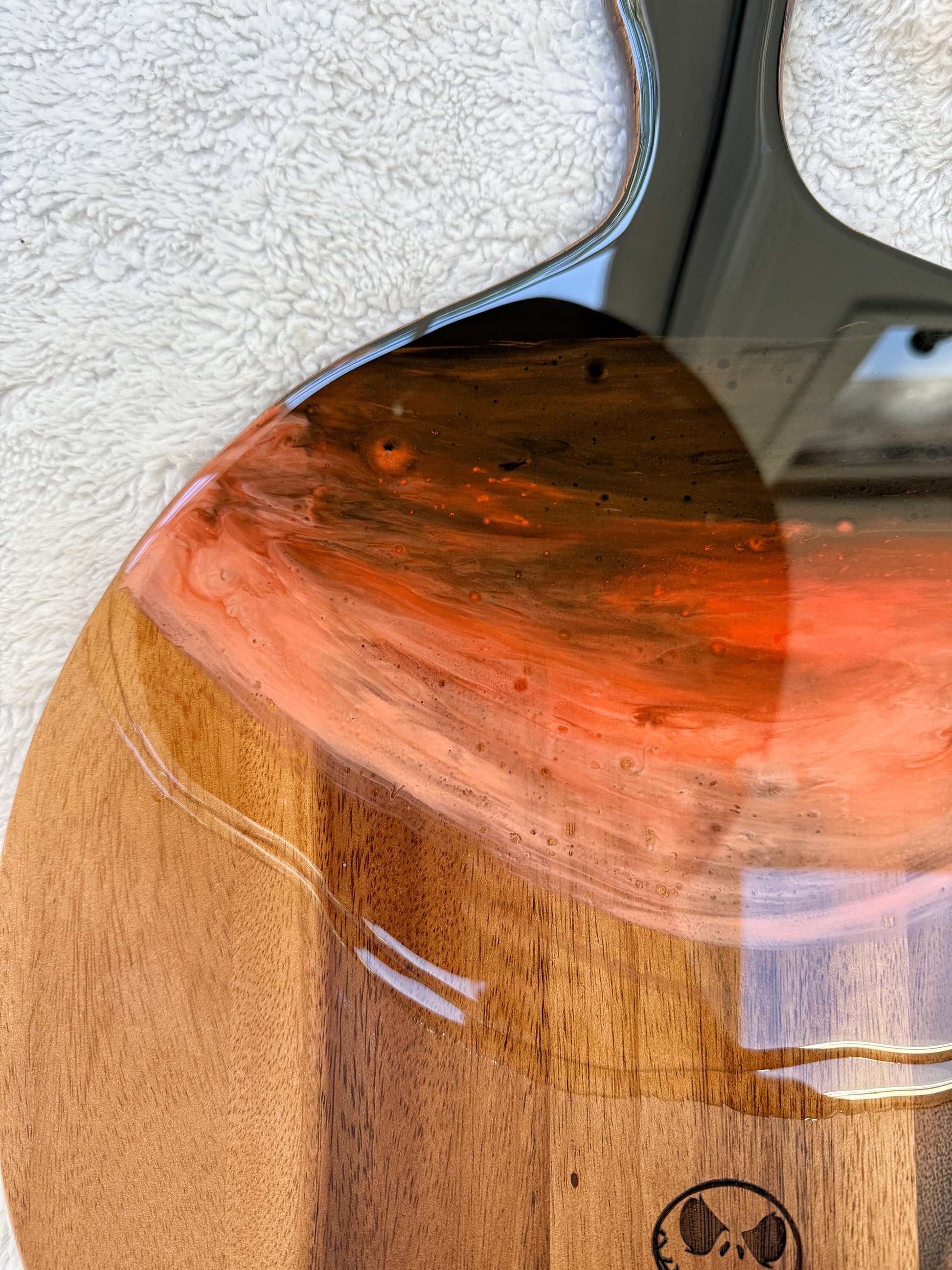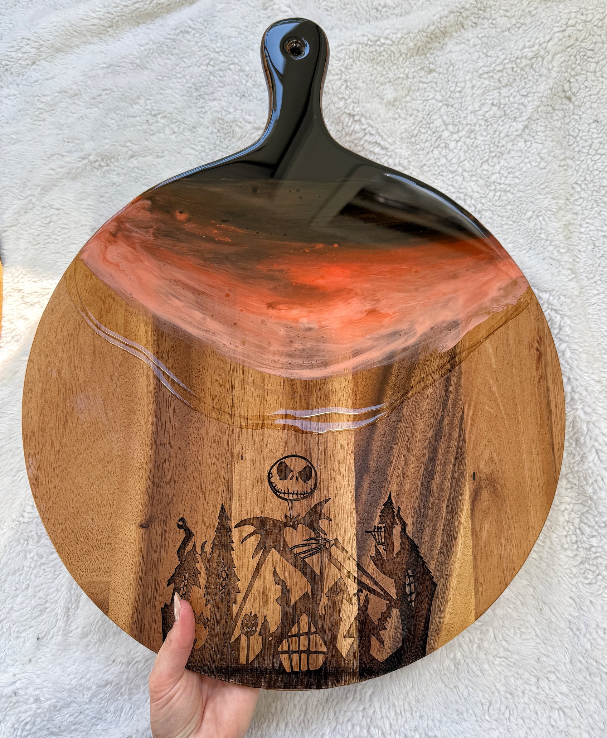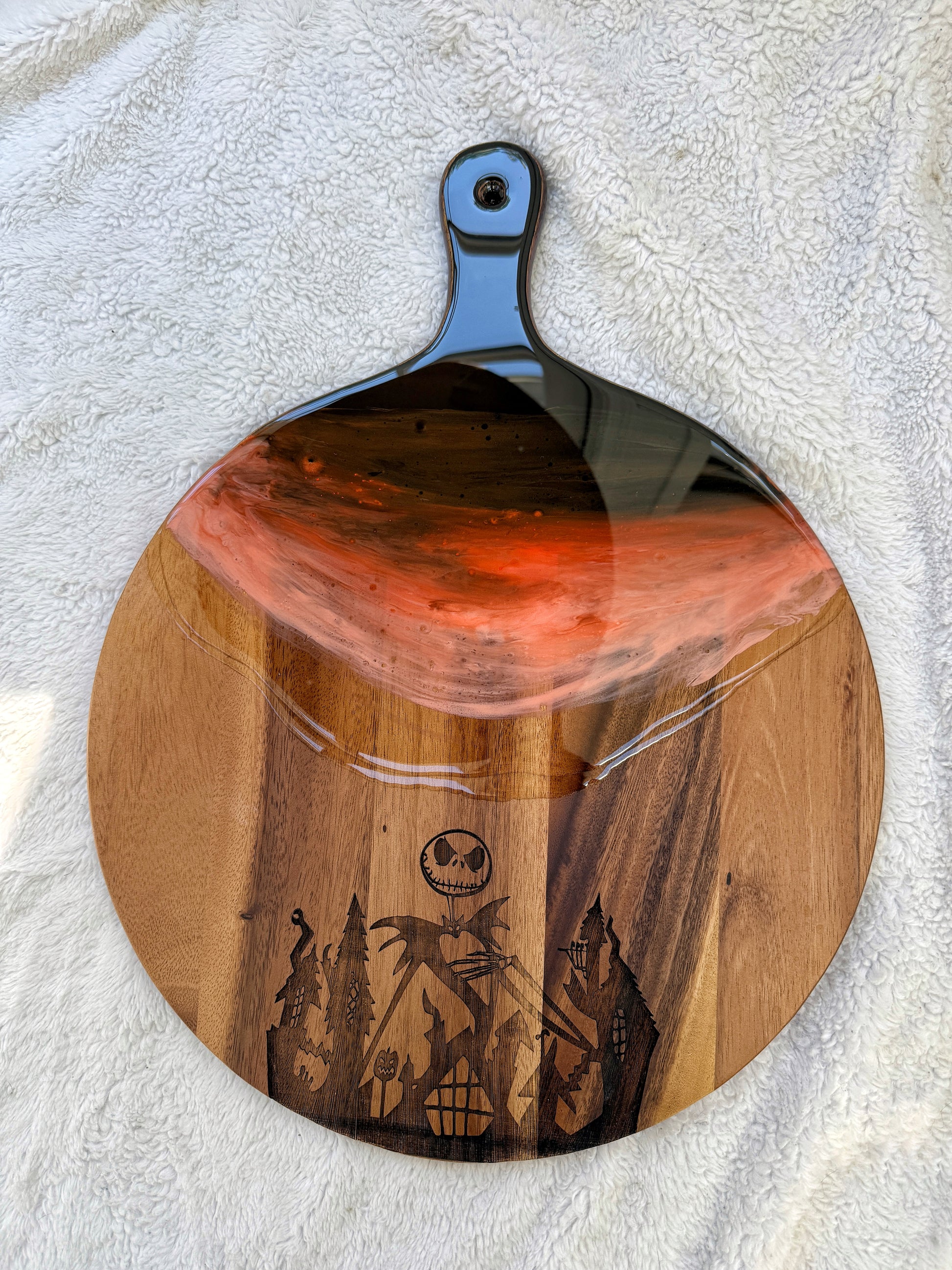 Each board features an intricate Halloween-themed laser engraving, hand-poured resin work (some with a wave, some without), and a rich, moody palette perfect for seasonal displays, charcuterie spreads, or as a one-of-a-kind decor piece.