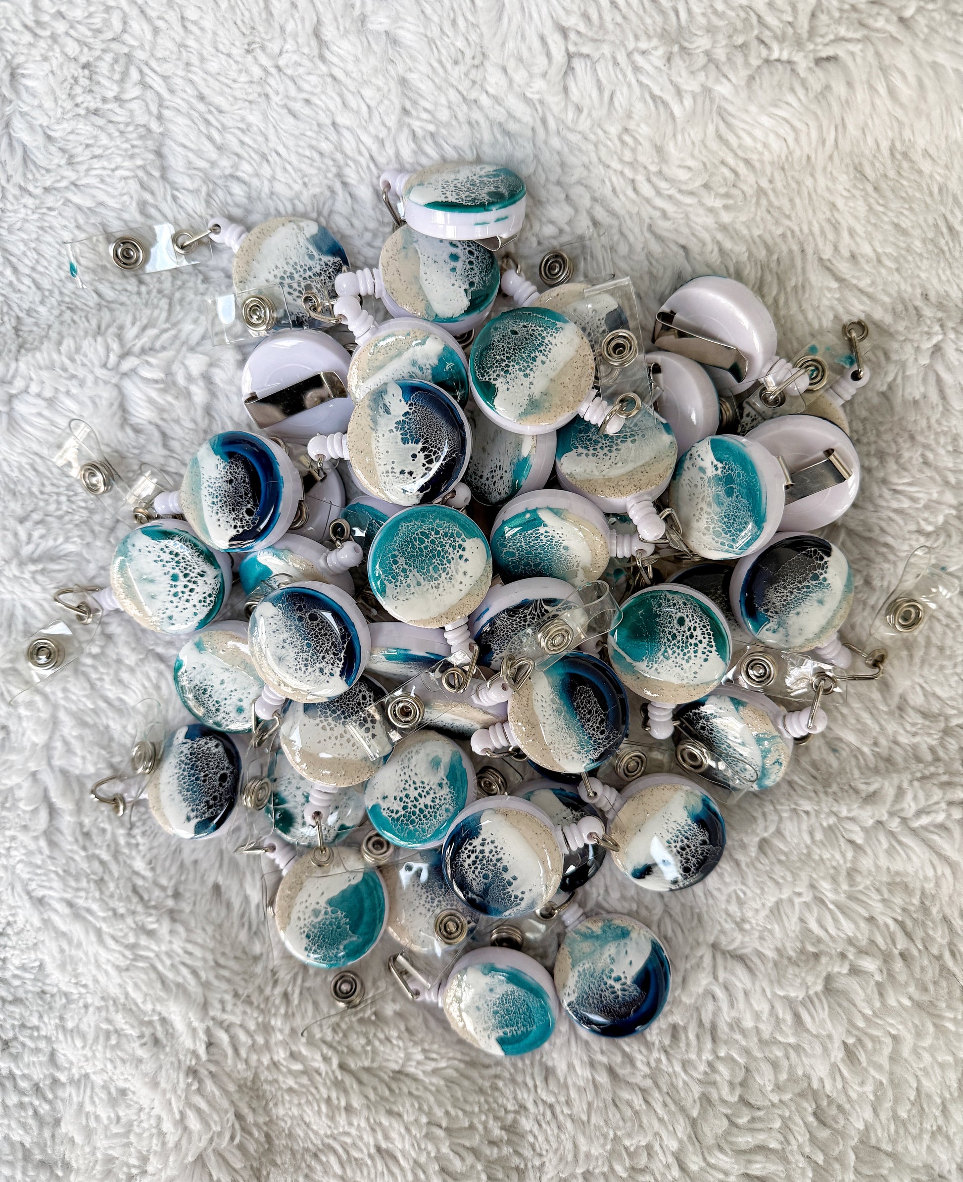 Premium white retractable reel holder with belt clip with resin wave top added.