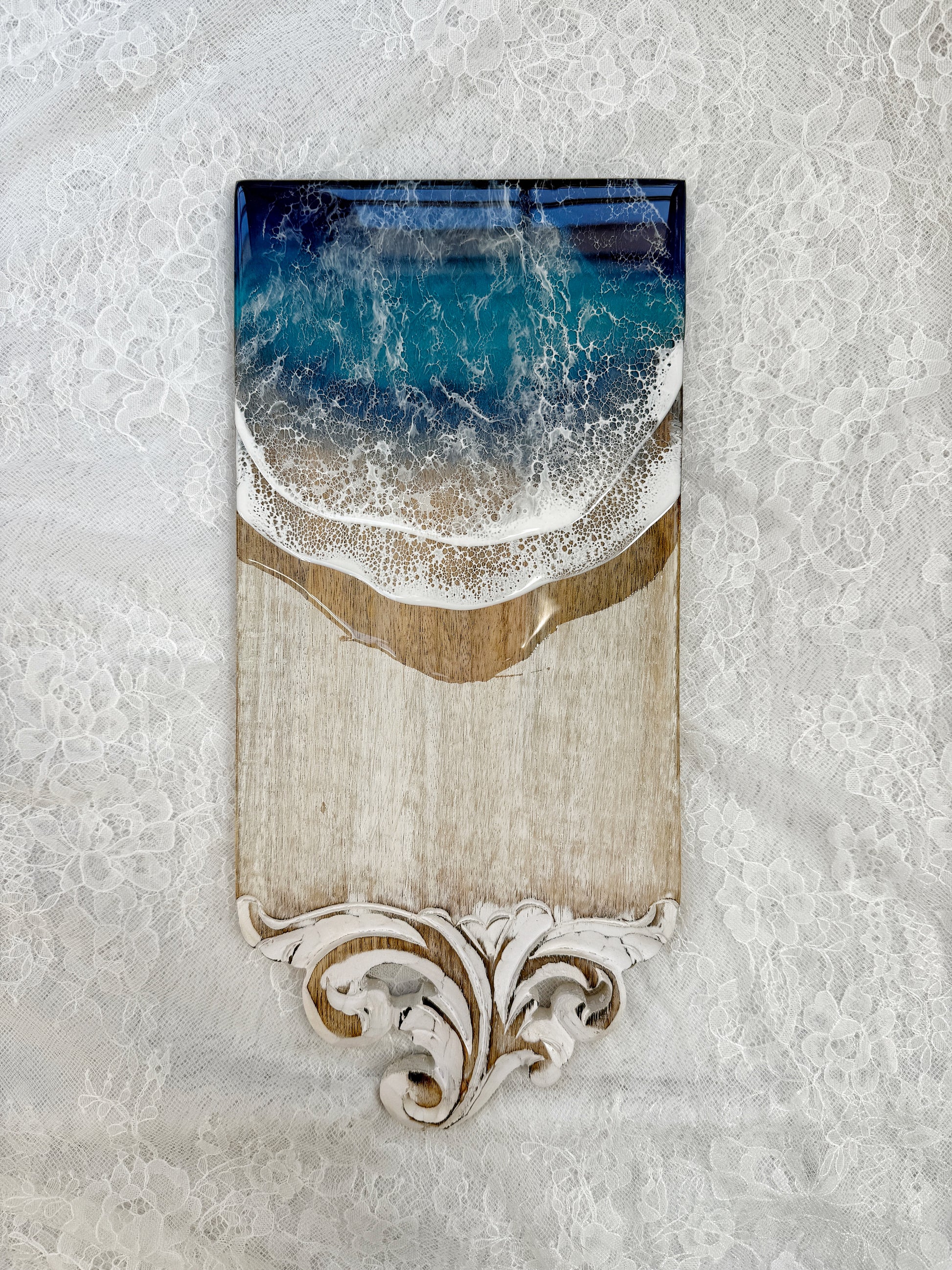 Ocean-inspired and made to stand out, this board features a hand-poured resin wave design and deep navy on natural acacia wood. Each one is one-of-a-kind.