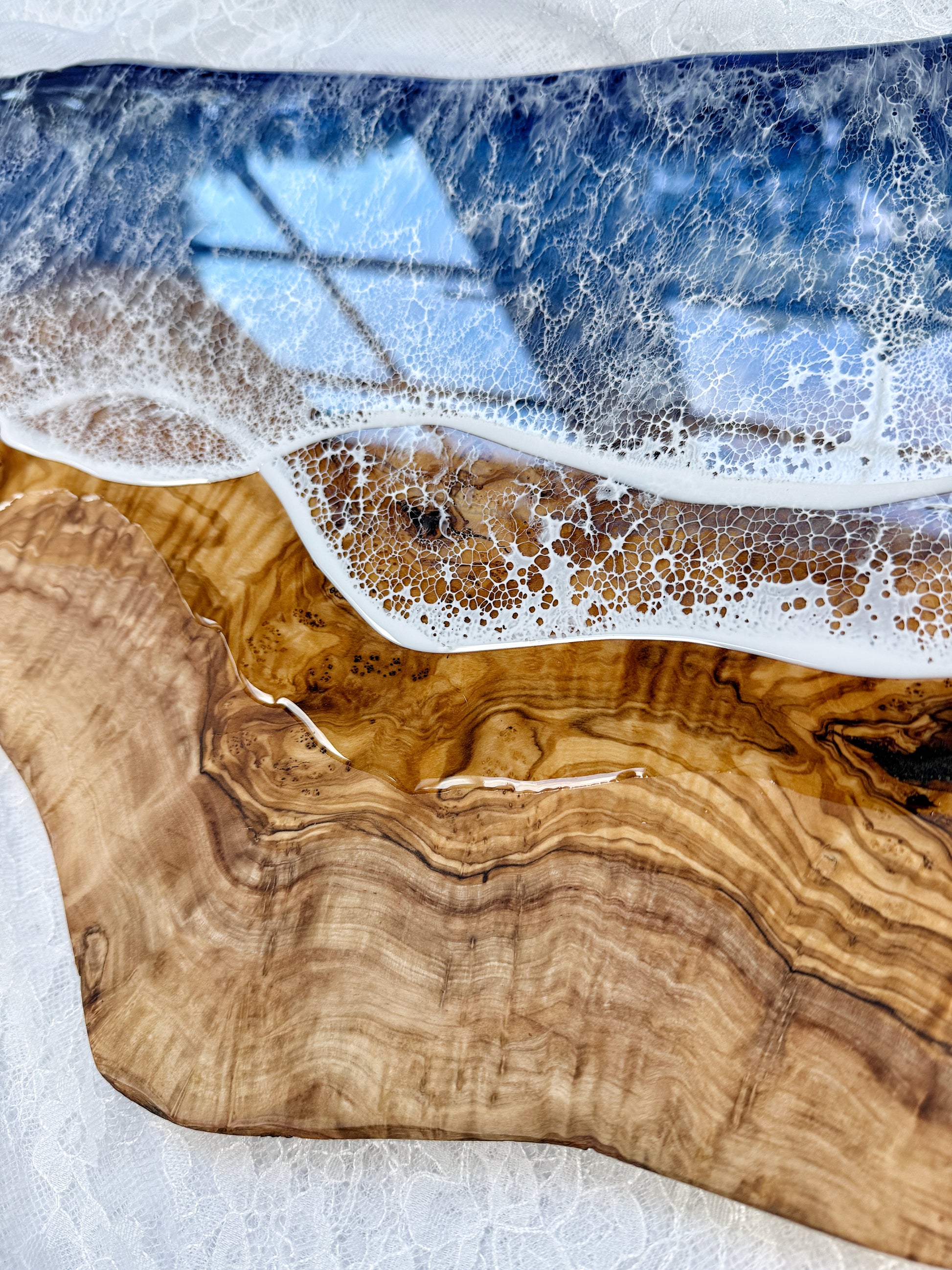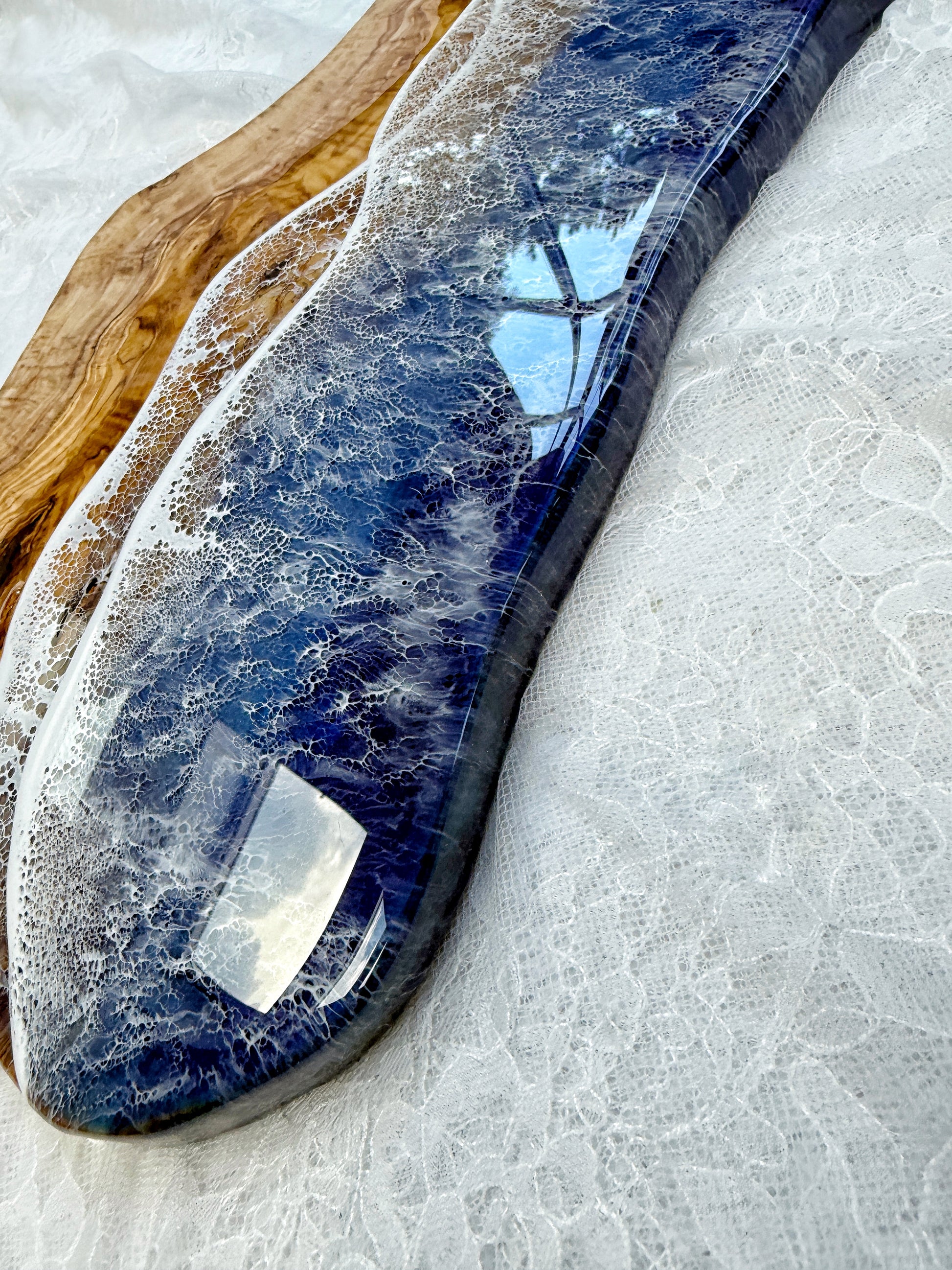 Ocean-inspired and made to stand out, this board features a hand-poured resin wave design and deep navy on natural acacia wood. Each one is one-of-a-kind.