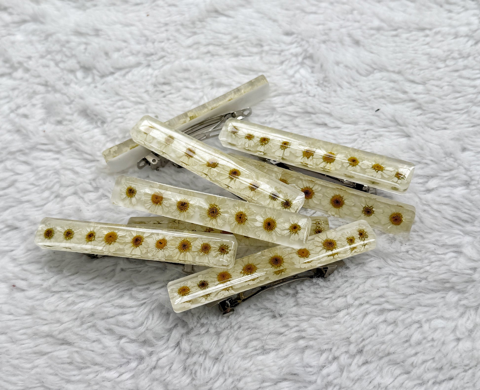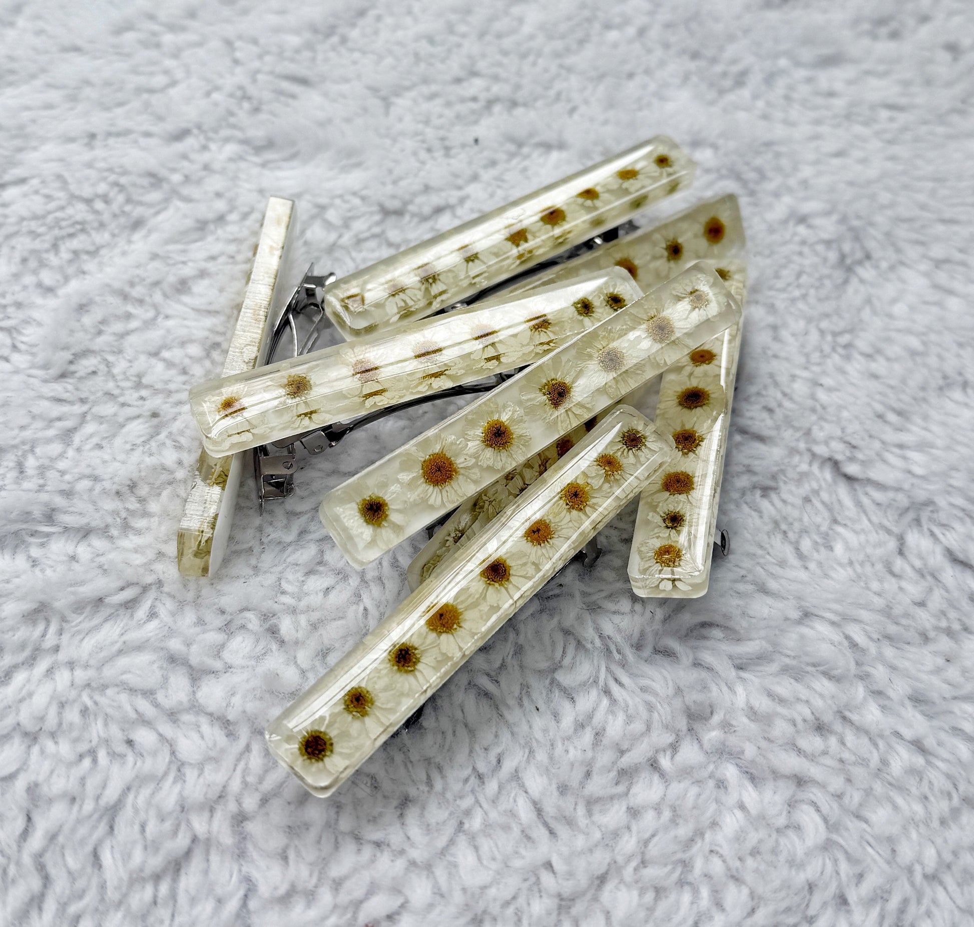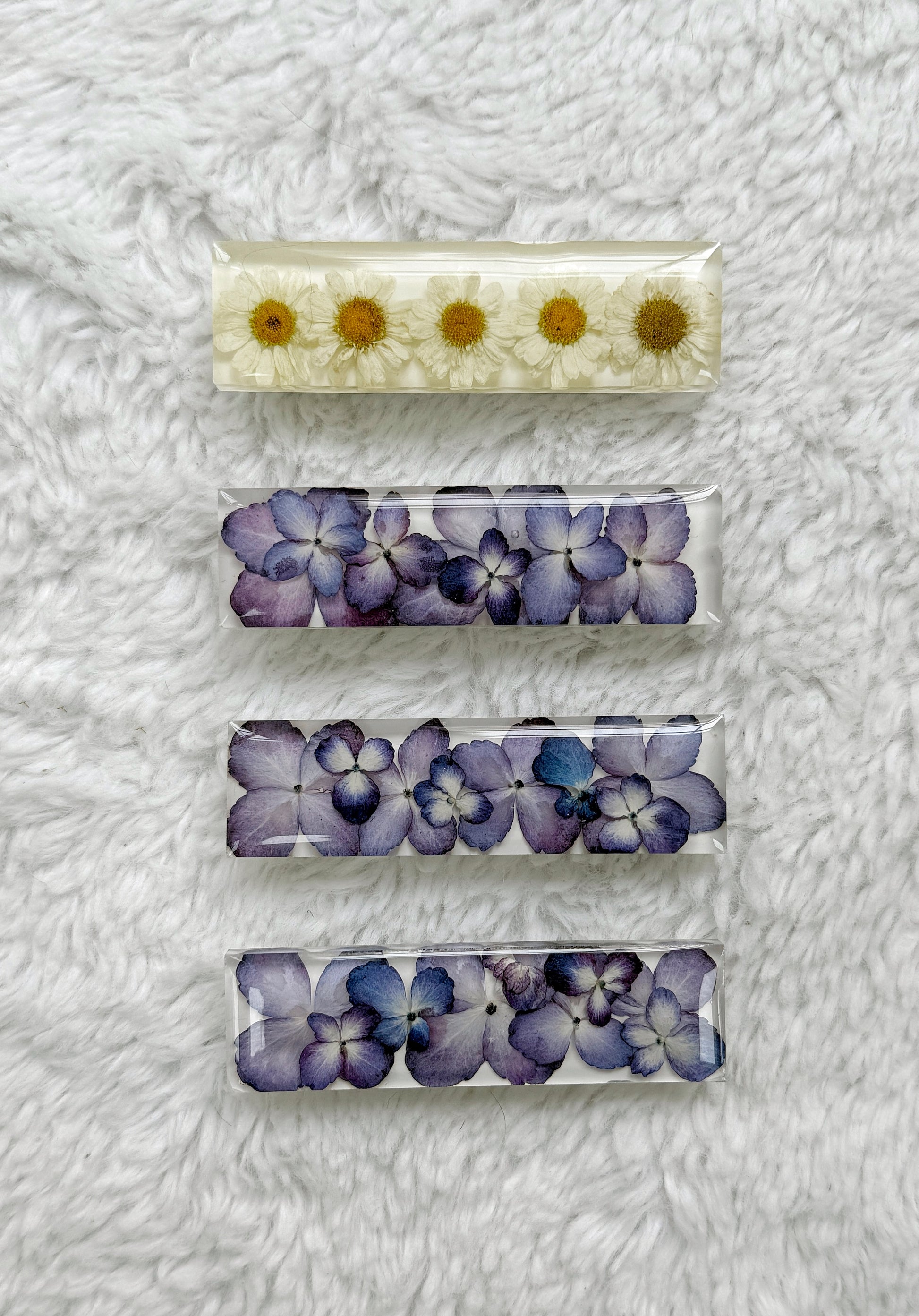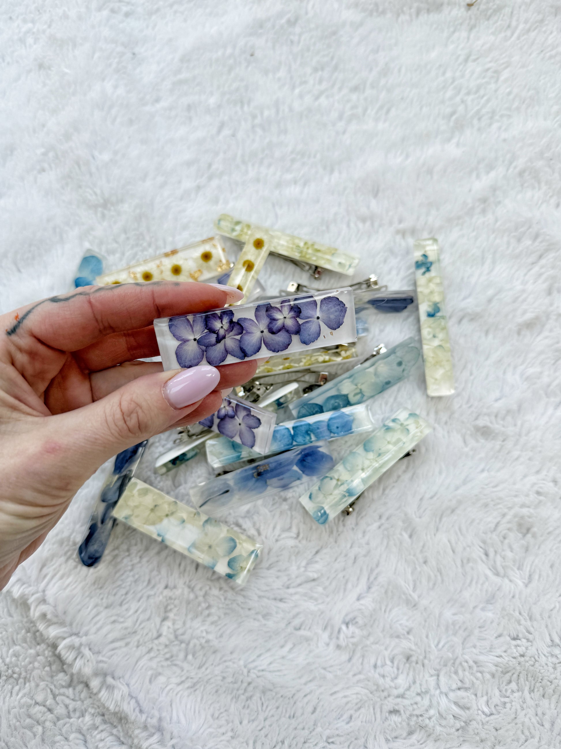 Delicate, lightweight, and one-of-a-kind — each barrette is handcrafted with real pressed florals suspended in crystal-clear resin. A soft mix of blue and white petals gives a fresh, airy feel that pairs effortlessly with casual hair days or something more polished.