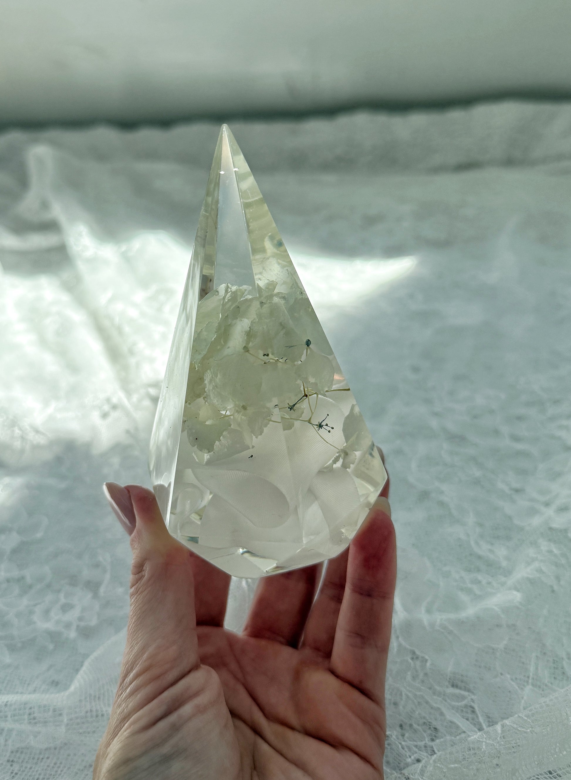 Preserve your cherished flowers with these elegant ring holders, designed to be both functional and decorative. Available in faceted pyramid or teardrop shapes, these pieces beautifully display your florals while offering a practical way to store your rings.